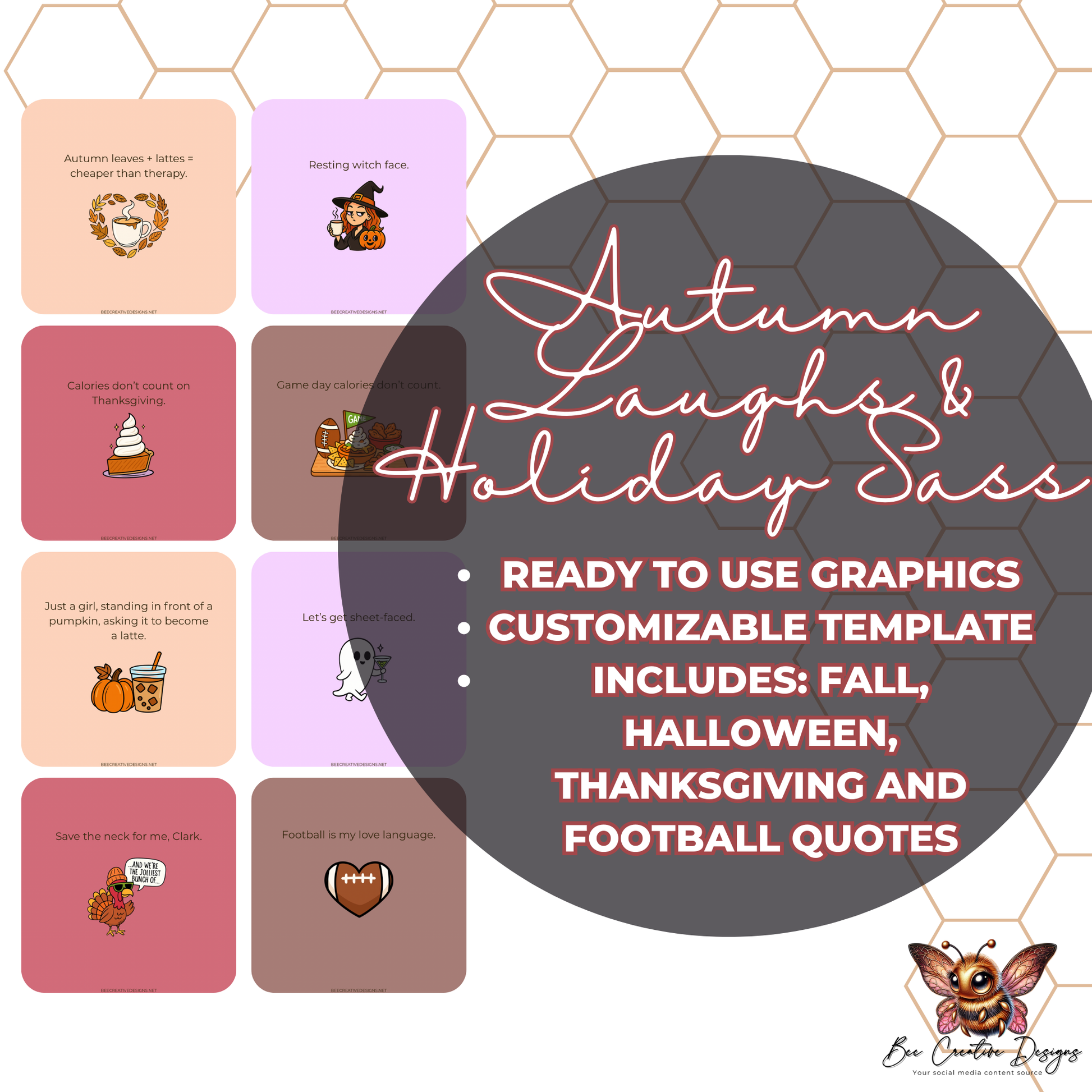 Spice up your socials with a big dose of sass, humor, and seasonal charm. This bundle is designed to keep your content lighthearted, relatable, and oh-so shareable all through fall and the holiday season. Whether you’re obsessed with pumpkin spice, can’t get enough of spooky season, live for stretchy pants at Thanksgiving, or cheer loudest on football Sundays—this pack has the perfect one-liners to keep your feed buzzing.