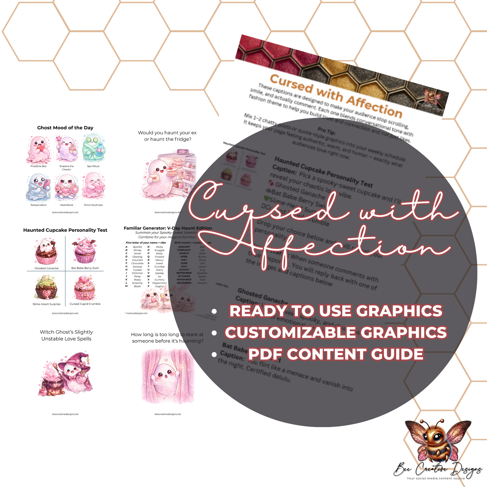 The Cursed with Affection bundle is a love letter from the afterlife, packed with playful, pastel paranormal vibes. It’s Valentine’s Day through the eyes of blushing spirits, snack-obsessed poltergeists, and emotionally unstable little boos who would rather haunt the fridge than confess their feelings.