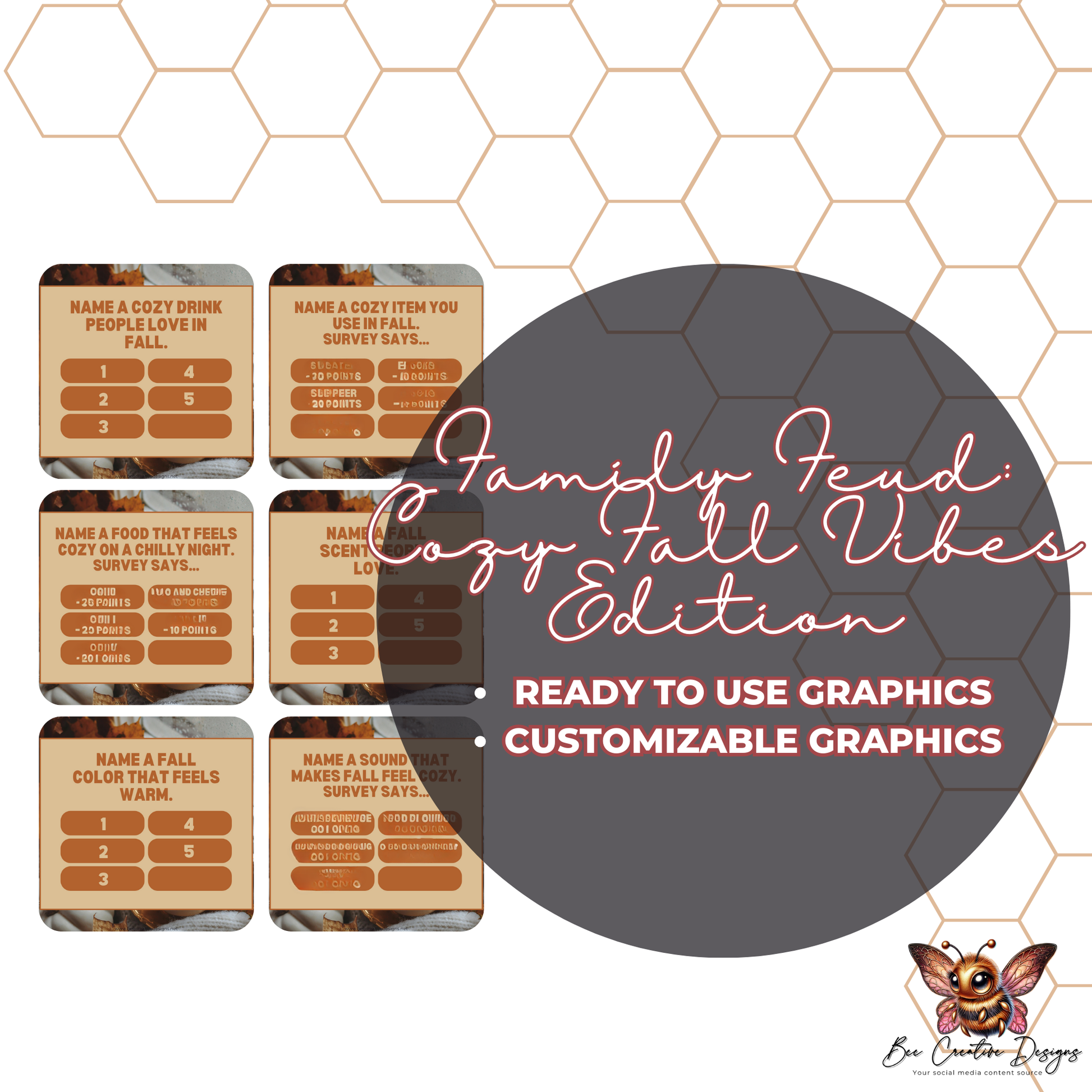 Perfect for small business owners and social media influencers, this Family Feud: Cozy Fall Edition Questions posts bring a fresh look to your feed without the hassle. Customize them in minutes with your own photos and brand colors for a stunning, cohesive look.