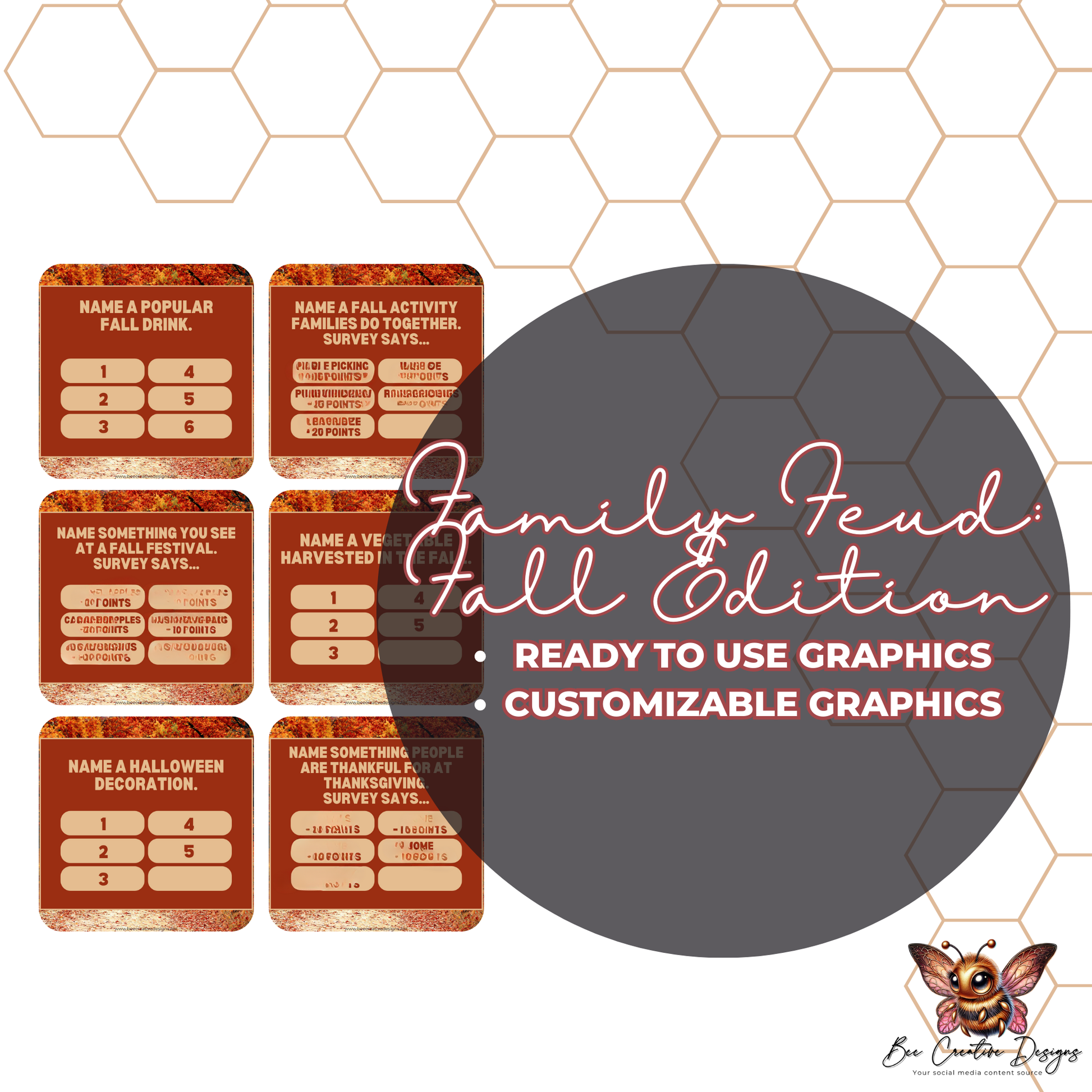 Perfect for small business owners and social media influencers, this Family Feud: Fall Edition Questions posts bring a fresh look to your feed without the hassle. Customize them in minutes with your own photos and brand colors for a stunning, cohesive look.