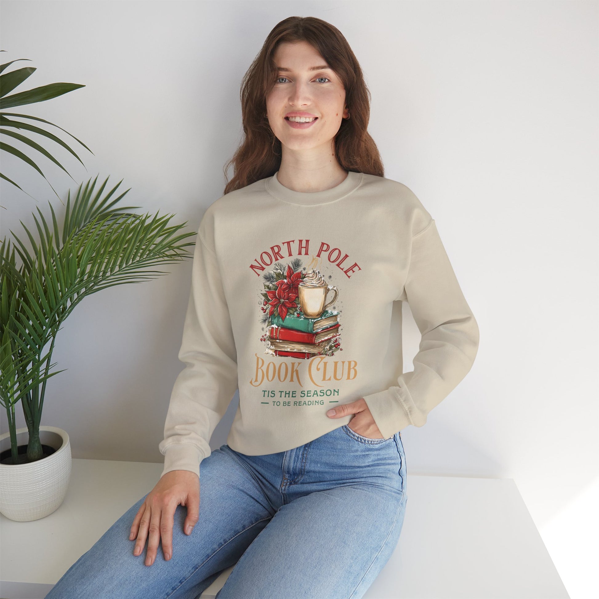 Cozy up this winter with the North Pole Book Club – “’Tis the Season to Be Reading” sweatshirt! Featuring a charming stack of festive books, a holiday mug, and a bright poinsettia, this design captures the magic of slow, cozy reading days during the holidays.