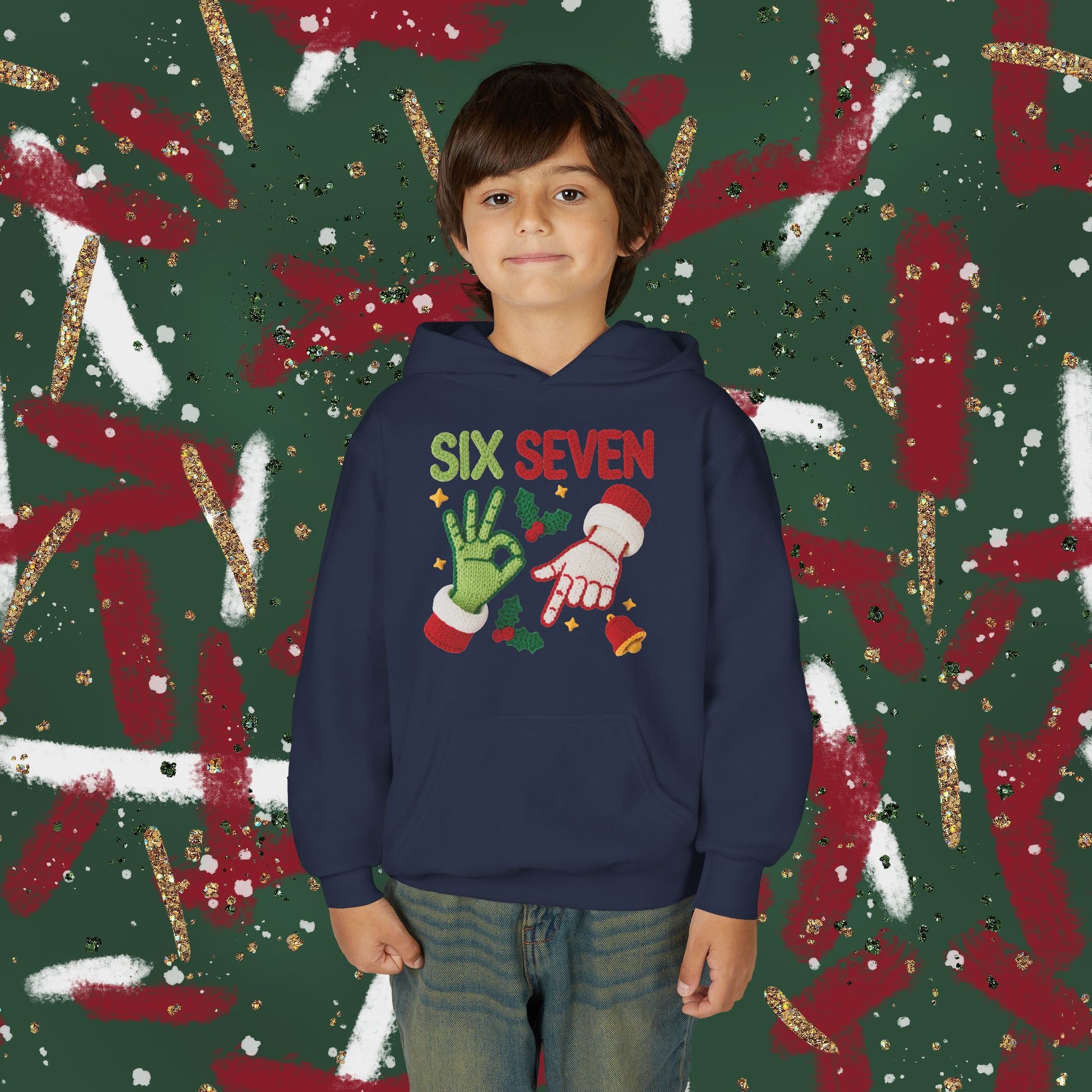 A cozy youth hoodie with playful holiday graphics that bring a cheeky, lighthearted energy to chilly days. The front features a colorful illustration of two gloved hands and festive accents, with the words “SIX SEVEN” in bold seasonal colors. Soft-medium weight fabric and a roomy kangaroo pocket make this hoodie comfortable for school runs, family gatherings, and snowy play. It wears like a comforting layer — warm, familiar, and a little mischievous — perfect for kids who love bold, fun seasonal style.