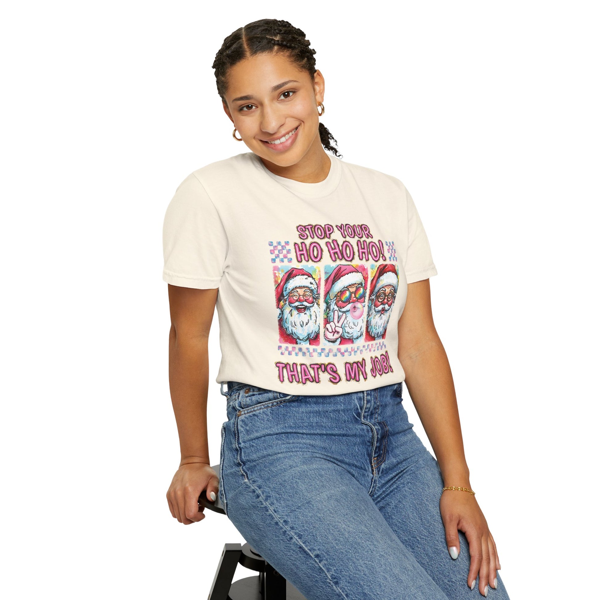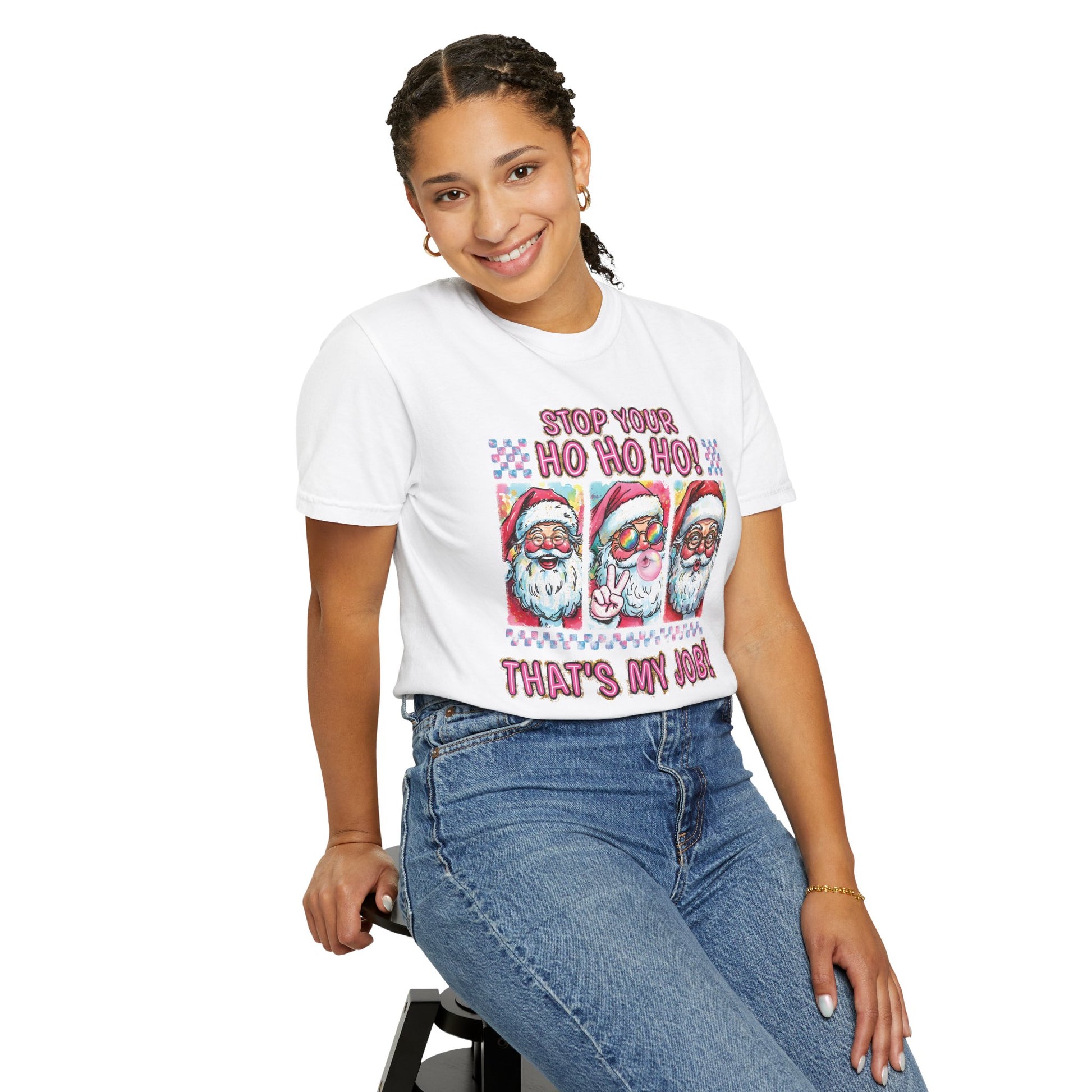 Bring some sass to your holiday wardrobe with this “Stop Your Ho Ho Ho! That’s My Job!” Funny Santa Claus Tee. Featuring cheeky Santa illustrations, glitter-inspired festive details, and a sarcastic twist on the jolly guy’s signature catchphrase, this design is perfect for anyone who likes their Christmas style bold and playful.