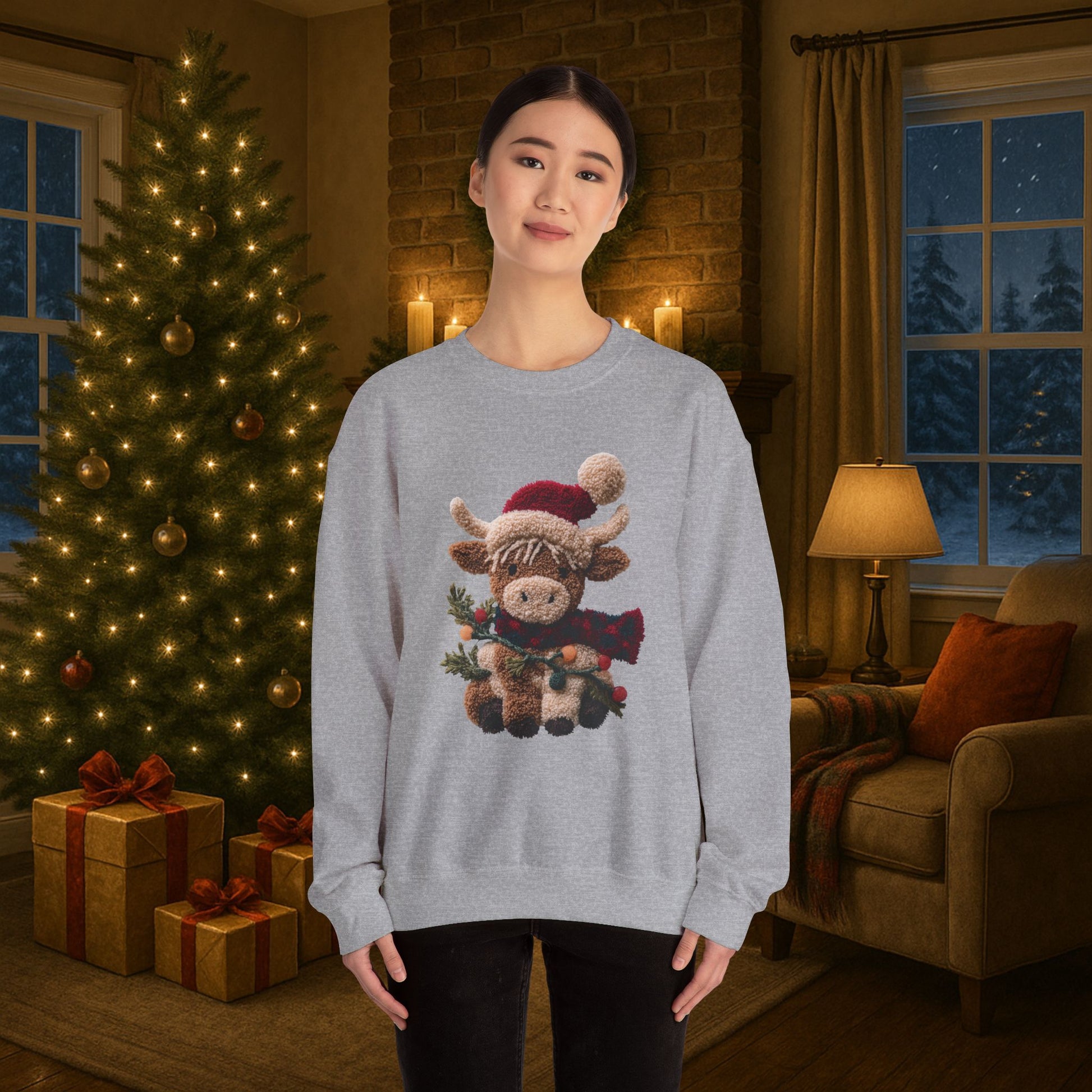 This cozy crewneck brings a touch of vintage holiday warmth to quiet winter evenings. Soft, slightly brushed fabric and a classic relaxed cut make it the kind of sweatshirt you reach for when you want comfort without fuss. A nostalgic Highland Cow in Scarf & Hat. rests on the chest, hand-stitched look that reads like an heirloom ornament you can wear. It layers easily over tees for chilly strolls to the market, settles in beside the tree while you wrap gifts, and keeps the season feeling gentle and familiar.